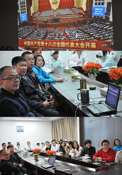 11月8日,中国共产党第十八次全国代表大会在北京隆重召开。为进一步深入学习贯彻党的精神,上午9时,成人影院 党总支组织全体党员在三楼会议室集中收看“十八大”开幕盛况。全体党员认真聆听胡锦涛总书记作的《坚定不移沿着中国特色社会主义道路前进,为全面建成小康社会而奋斗》主题报告,感受党领导全国人民走过的光辉历程和所取得的巨大成就的鼓舞。