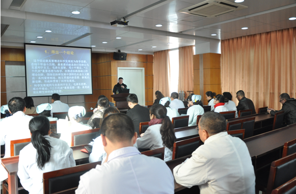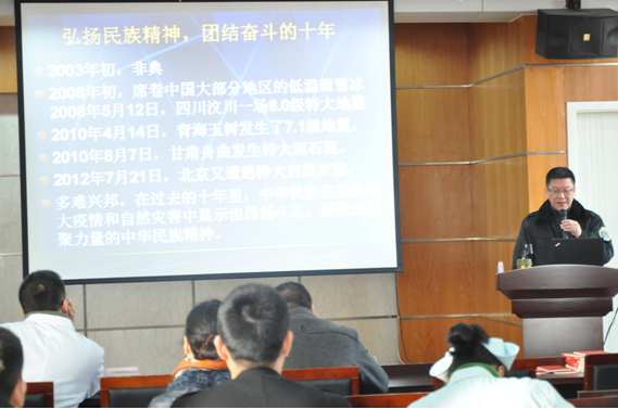 会议上,全体党员首先回顾了党的指导思想发展历史和十六大以来取得的辉煌成就,深刻感受到党组织领导下的国家飞速改革发展。随后,施肖峰书记就最近全球及国内一系列的新变化,结合自己对十八大报告中提出的新思想、新观点、新论述的理解,对报告中的关键词——“中国特色社会主义道路”、 “科学发展观”、“全面建成小康社会”和“统筹推荐城乡社会保障体系,提升人民健康水平”等深层意义进行了诠释。在讲解中,会场气氛热烈鼓舞,全体党员认识到,在十八大报告中,处处闪耀着以人为本、美丽中国的现化代愿景。