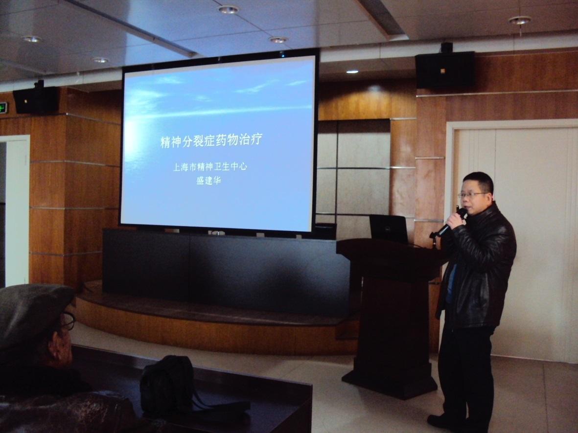 会议室,来自上海交通大学医学院附属精神卫生中心的盛建华主任给医护人员和部分病人家属讲授了精神分裂症的药物治疗相关知识。