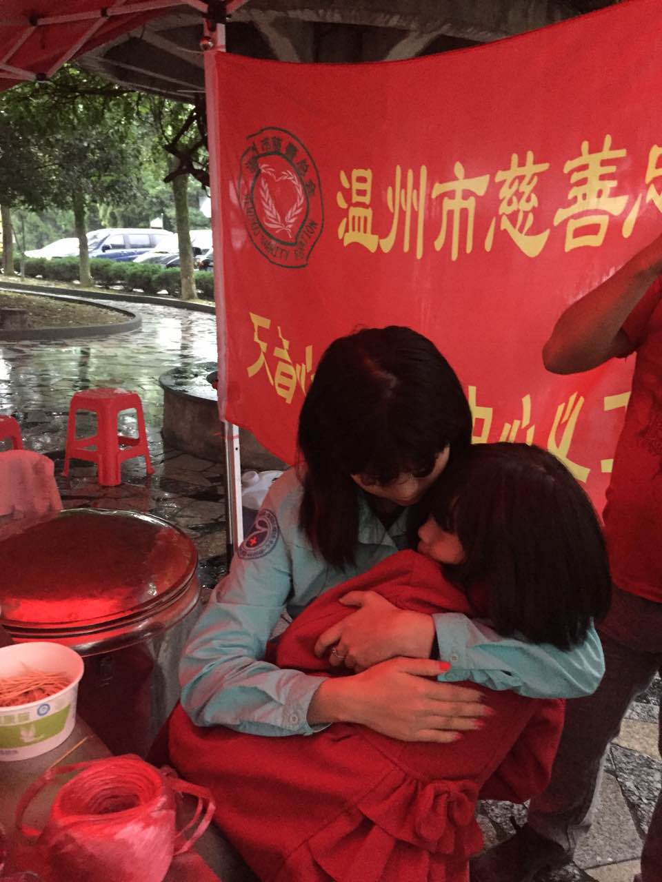应梦珍注意到她,走过去拥住她,轻轻和她说话。小女孩紧紧地回抱住应梦珍。应梦珍就势坐到凳子上,紧紧把她抱在怀里。小女孩虽然穿着大衣,但小手冰凉凉的,小小的身体一直在颤抖。应梦珍低头努力把她环抱得更紧,用自己的体温给她带去一些温暖。经过了解,得知小女孩是刚刚跟随奶奶、阿姨从福建赶来温州的,她的妈妈在这次民房垮塌中不幸去世了。