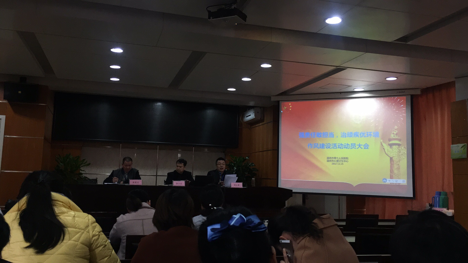 会上,胡立荣书记部署了《中共温州市卫生和计划生育委委员会关于印发在全市卫生计生系统开展“强责任敢担当,治顽疾优环境”作风建设活动工作方案的通知》文件精神。胡书记指出,一是务必要提高认识,认清当前的形势变化,对医疗服务态度生硬、收取红包回扣等顽疾,要以踏石留印、抓铁有痕的决心抓好作风建设,增强责任心,提高执行力,严格卫生行风建设“九不准”规定;二是务必要身体力行,要有“不求过得去,但求过得硬”,“对得起这段历史、对得起这个地方”的决心,以“五查五看”为抓手,通过集体自查、外界帮查等方式深入查找存在的作风问题,要把问题找实、找深、找透,为整改落实打好基础;三是务必要严格整改到位,要增强问题导向、实绩导向、责任导向意识,做到问题有整改、整改有督办、督办有落实,为新形势下创建和谐医患关系创造良好机会;四是务必要增强协作意识,各病区、各科室要形成合力,形成自上而下互联、互通、互动的格局,努力实现在机制、制度上解决根本性问题。