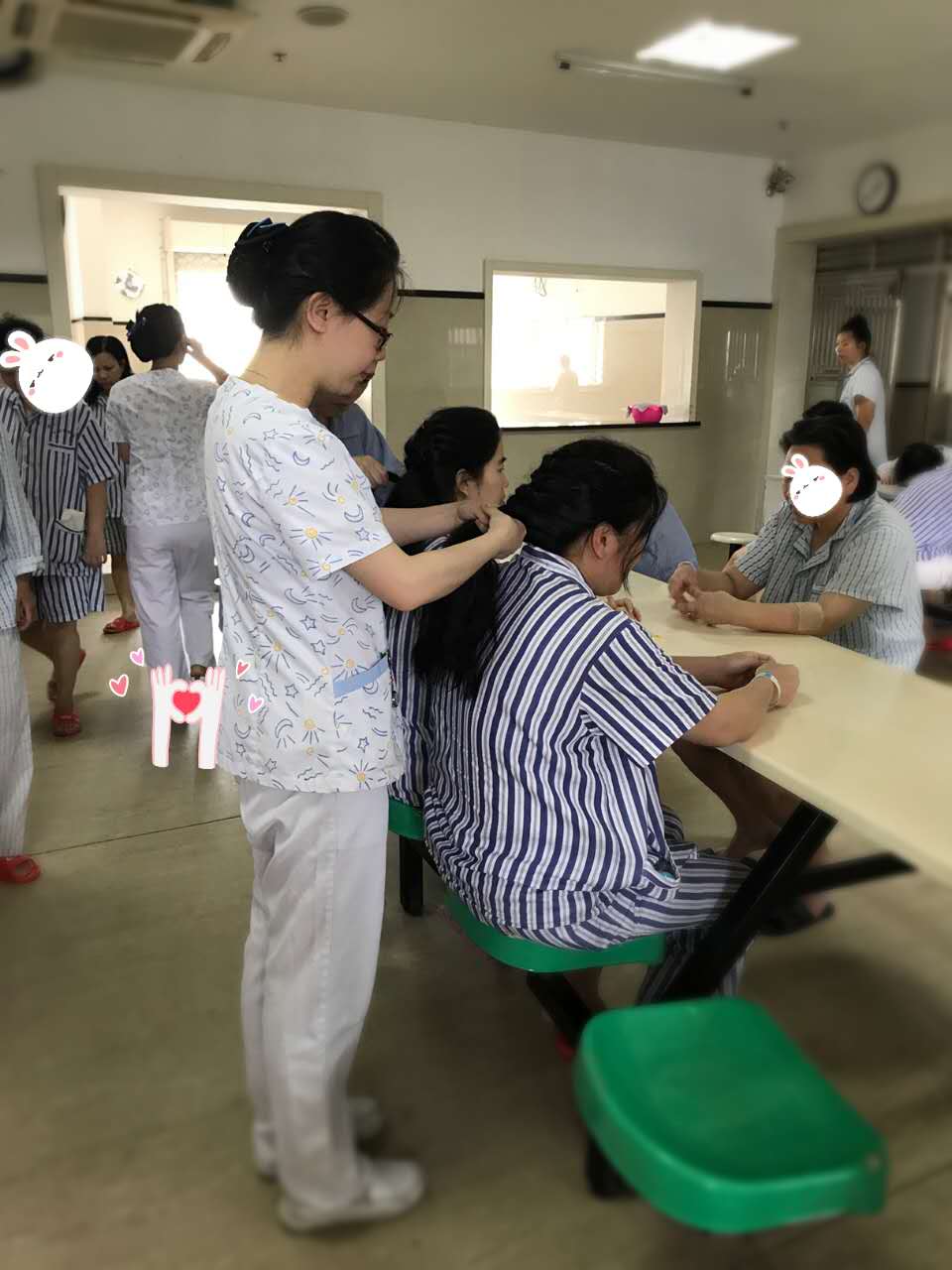 的确,护士们不但不能跟精神病人计较,而且还要将她们视为亲人般照顾。这不,王丽煌最近又学了个“新技能”,为女病人们扎各种美丽的发型。每次病人们吹干头发,王丽煌便开始“大展身手”,为病人们的发型“美容”。因为大多数女病人都是长头发,“身怀绝技”王丽煌还会为其女病人传授技能,病友之间互相学习借鉴、相互帮助,帮助病区病人打扮得漂漂亮亮的,不仅促进了护患关系不说,还拉近了医患、病友之间的距离。