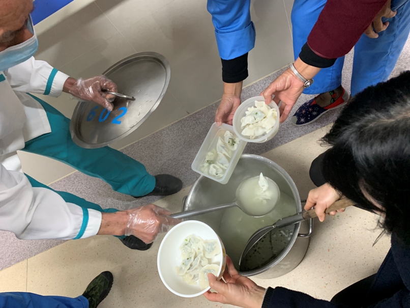 当老师伯拉着饭车进病室时,大家蜂拥而至,带着“工具”等待着美餐。瞧他们吃得多开心啊,一个个都在光盘行动。他们是那么的容易满足,几个饺子就幸福满满,老人家都纷纷表示这样的活动应该多多益善,又可以操起“包饺子”老本行,还可以相互探讨、学习五花八门的饺子的包法,最嘚瑟的是自己包的饺子就是特别好吃。患者家属也均表示住在这样的病房里心很温暖。