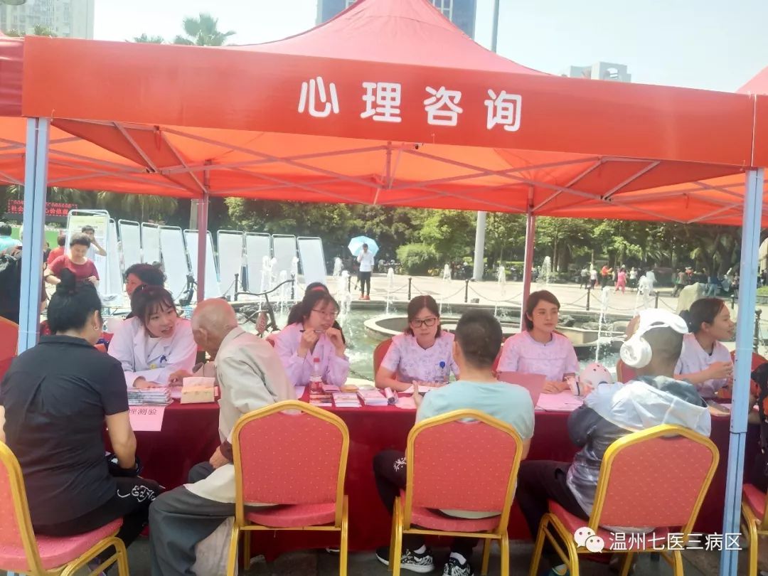 的四位志愿者黄佳佳、林晓曙、张夙兮、陈曼在护理部方春霞主任的领导下早早来到活动现场,布置会场,为排队等待的市民提供心理咨询。