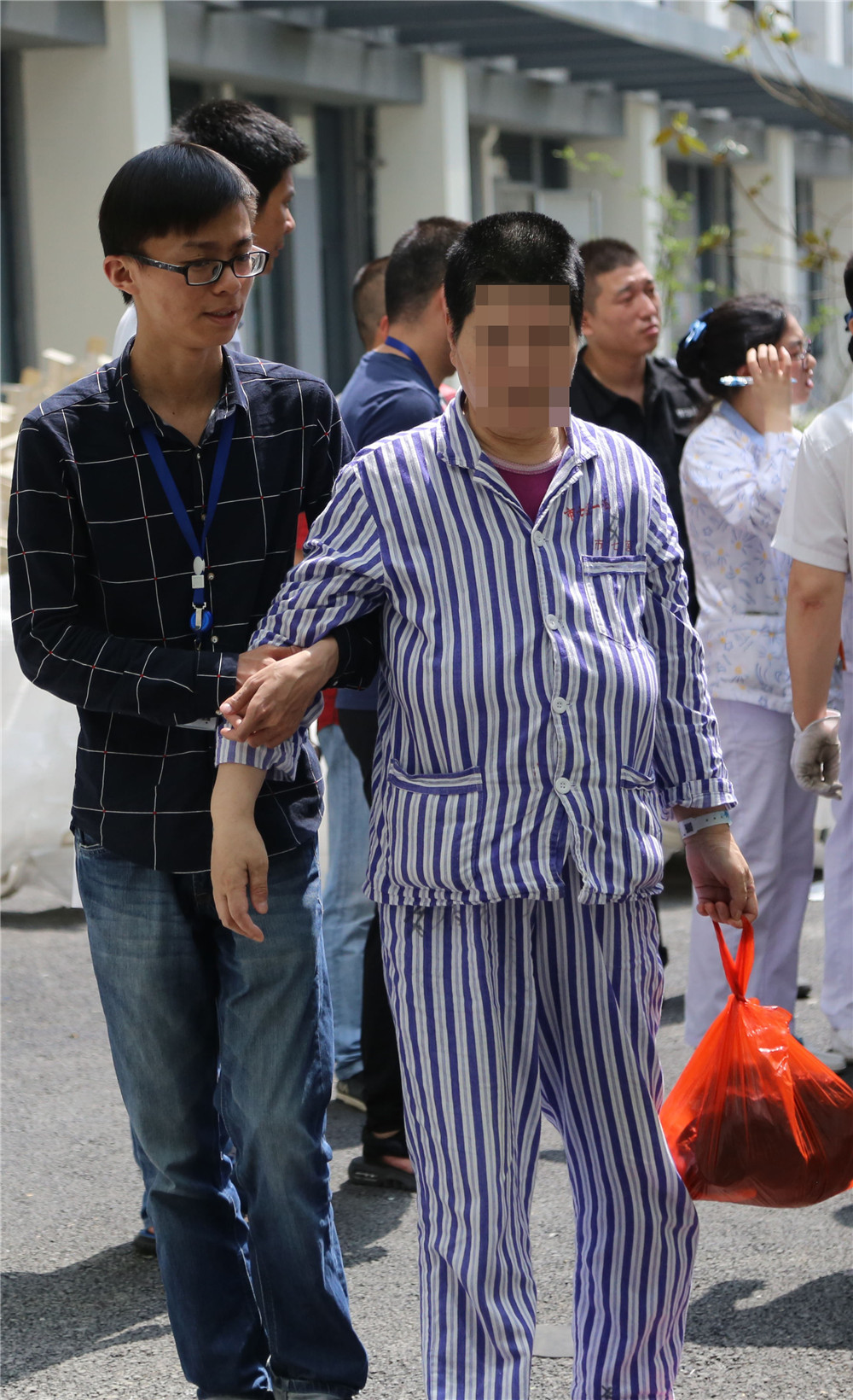 抬担架、推轮椅、搀扶,行政人员看到患者的衣襟不够整齐,帮忙妥妥扣好;这位家属东西太多,医护人员帮忙一起拎着;医院领导、各职能科室科长、普通行政人员……到处都是关切的身影!