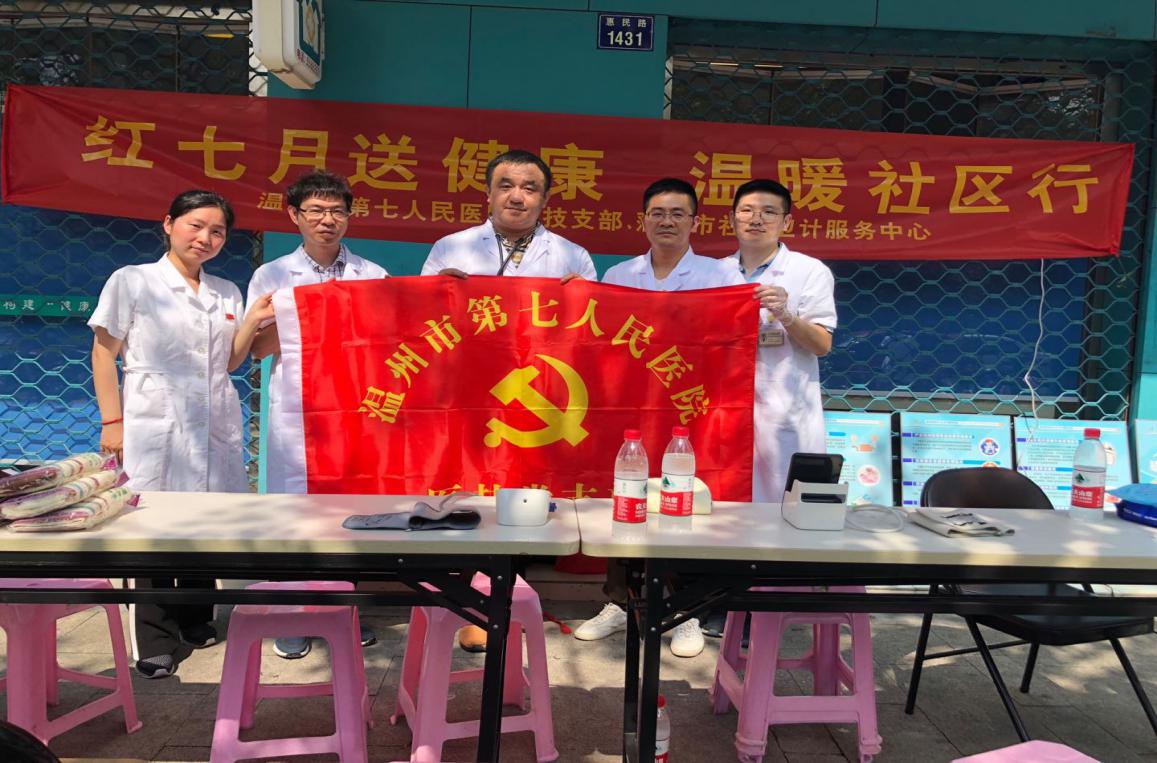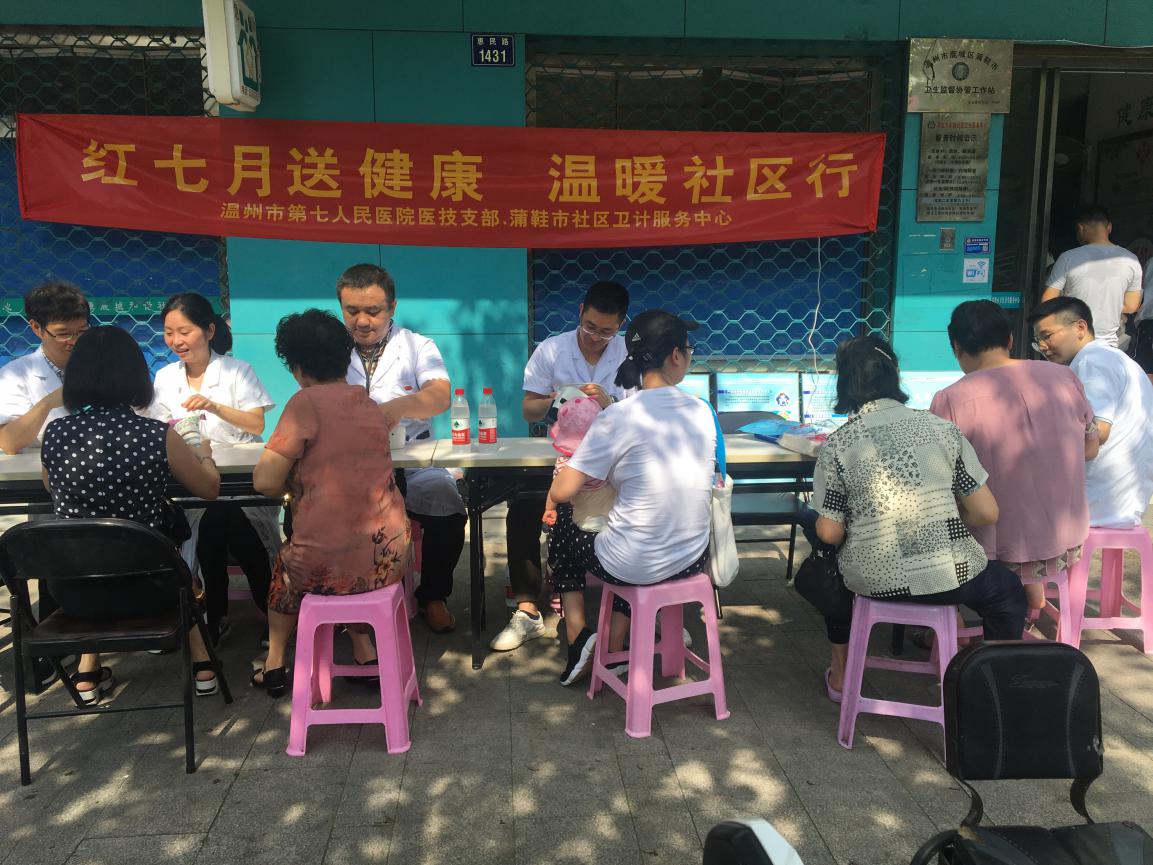 医技党支部与蒲鞋市街道卫生服务中心党支部联合在蒲鞋市街道青园社区开展“红七月送健康,温暖社区行”活动,医技支部周严灿、孟雷、陈晔、马邦程、黄瑶驹等党员参加活动。