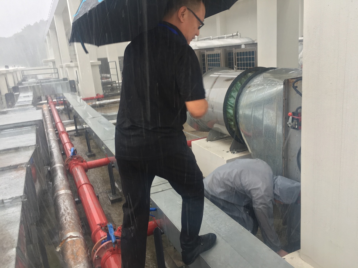 11日一早,当总务科得知住院楼顶排水口可能堵塞的情况后,为控制水情立即召集物业人员一起前往十一楼楼顶疏通各个排水口。尽管风雨交加,工作人员全身被大雨一遍遍地浇透,但想到积水可能带来的严重影响,大家还是坚持将排水口污物完全清除,同时还处理了防汛抗台中的其他维修事项,有效、及时排除了隐患。