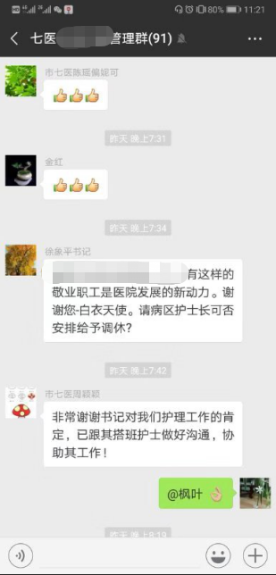 “有这样敬业的职工是医院发展的新动力。谢谢你——白衣天使。”图片在群里流传后,市七医党委书记徐象平也在群里第一时间点赞,还嘱咐病区护士长尽量给予安排调休,让带病坚守岗位的谢陆秀能够尽快康复身体。