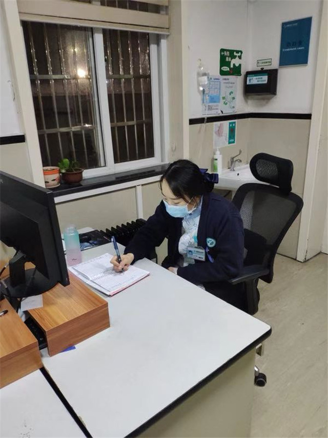 记者了解到,照片中的护士叫谢陆秀,所在病区收治的病人均是110送来的流浪精神患者。当天晚上,二十二病区的3个区域内均有一名护士负责值班。“下午4:30上班时,突然头疼得厉害,一测体温有38.5°。”谢陆秀说,当时白班护士陆续下班了,想着临时请假没有人顶岗,便找病区的陈瑶偏医生诊断并开了药。为了尽快让自己恢复到工作状态,于是“见缝插针”让同事给挂上了点滴,顺手又将晚上需要派发给病人的药品进行了清点登记。而为了不影响他人,她全程戴着口罩工作。